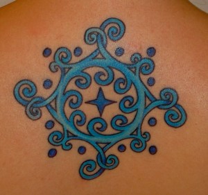 This design incorporates both dynamic and static elements. The spirals on eight points of the sun evoke the turning of the year; within each pair, one spiral is slightly larger than the other, giving the whole design the appearance of turning or rotating. In the center is a four-pointed star, a symbol of my goddess, Brighid Star Fire, in her stellar aspect while evoking her connection with the stability of earth, and this pattern of dynamic and stable elements is echoed again in the spheres or “sundrops” around the outside of the sun, in four groups of three that effectively “square the circle” in their arrangement.The wave-like design on the inside of the sun and the blue color represent the “fire in the water/water in the fire” aspect of the Celtic goddess of inspiration, integration and transformation. As a special, personal touch, the spirals and dots along the outer rim of the sun add up to 28 in total, in honor of the fact that I designed the tattoo just before and had it done just after my twenty-eighth birthday.