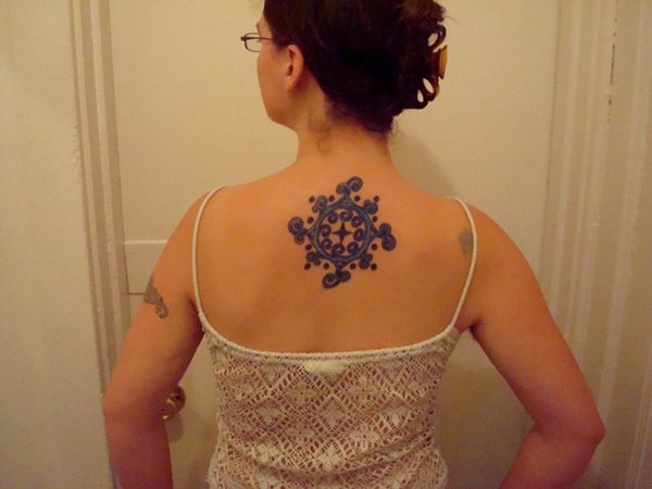 Note: I have slight scoliosis, which means that even though the tattoo is technically centered on my back, the curve of my spine can often make the tattoo appear a little bit crooked unless I’m really concentrating on holding my shoulders exactly straight. That said, the design is meant to appear asymmetrical because of the uneven size of the spirals, so it’s important to keep that in mind and be comfortable with that choice before getting any permanent tattooing done. I think I’ve already gotten some odd looks from people who don’t realize it was intentional!