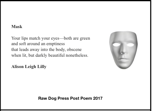 My poem “Mask” (above) is featured as this month’s Post Poem by Raw Dog Press, an independent publisher since 1972 specializing in post card poetry and chapbooks.