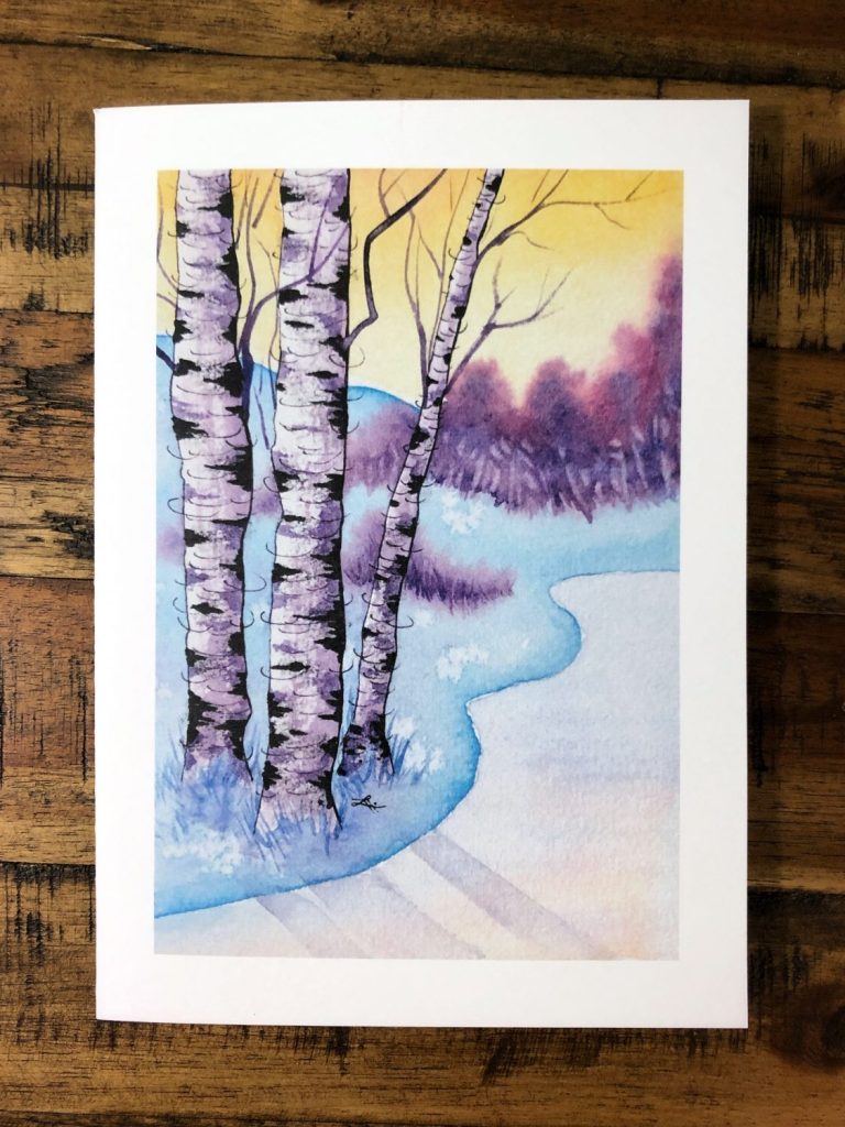 I’m especially thrilled to be able to offer this set of cards from my “Birches at Sunrise on the Winter Solstice” series. I first created this series during the 2018 holiday season as gifts for family and friends. While most winter holiday cards feature red-and-green color schemes or nighttime scenes, I wanted to create something that spoke to the sense of nascent hope and expectation that’s so magical about this time of year.